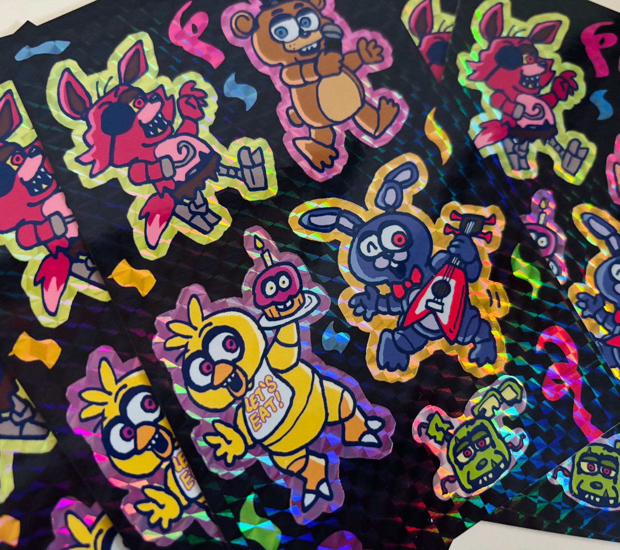 5x4 inch prismatic kiss cut sticker sheet featuring some of your favorite animatronics…join them for a bite 😏