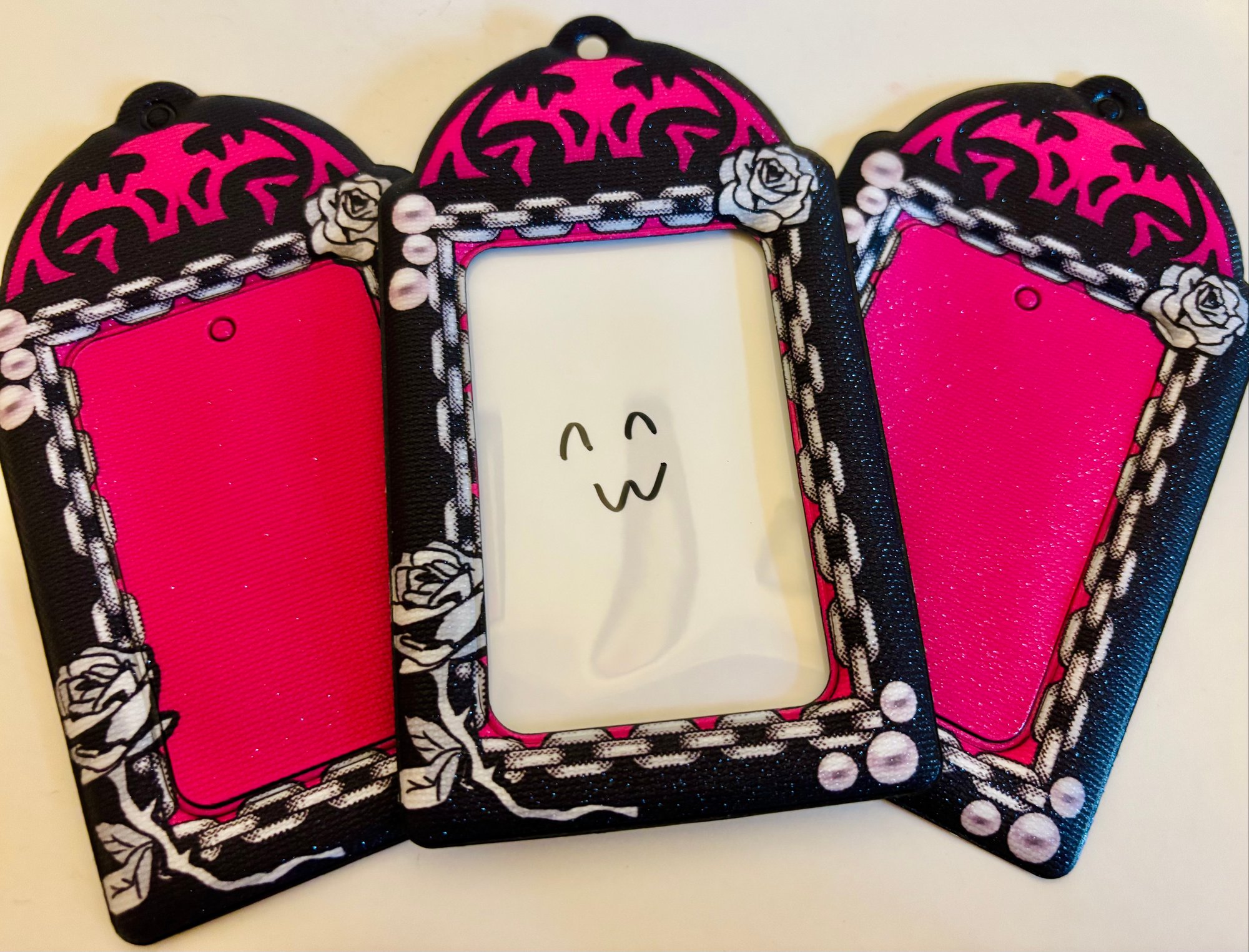 ~4in PVC card holder with glitter details. This item will come with a ball chain, the middle part will peel away to reveal the transparent middle!